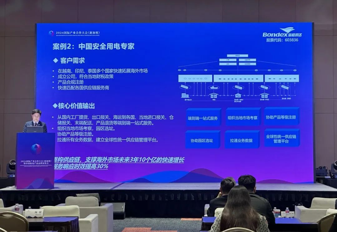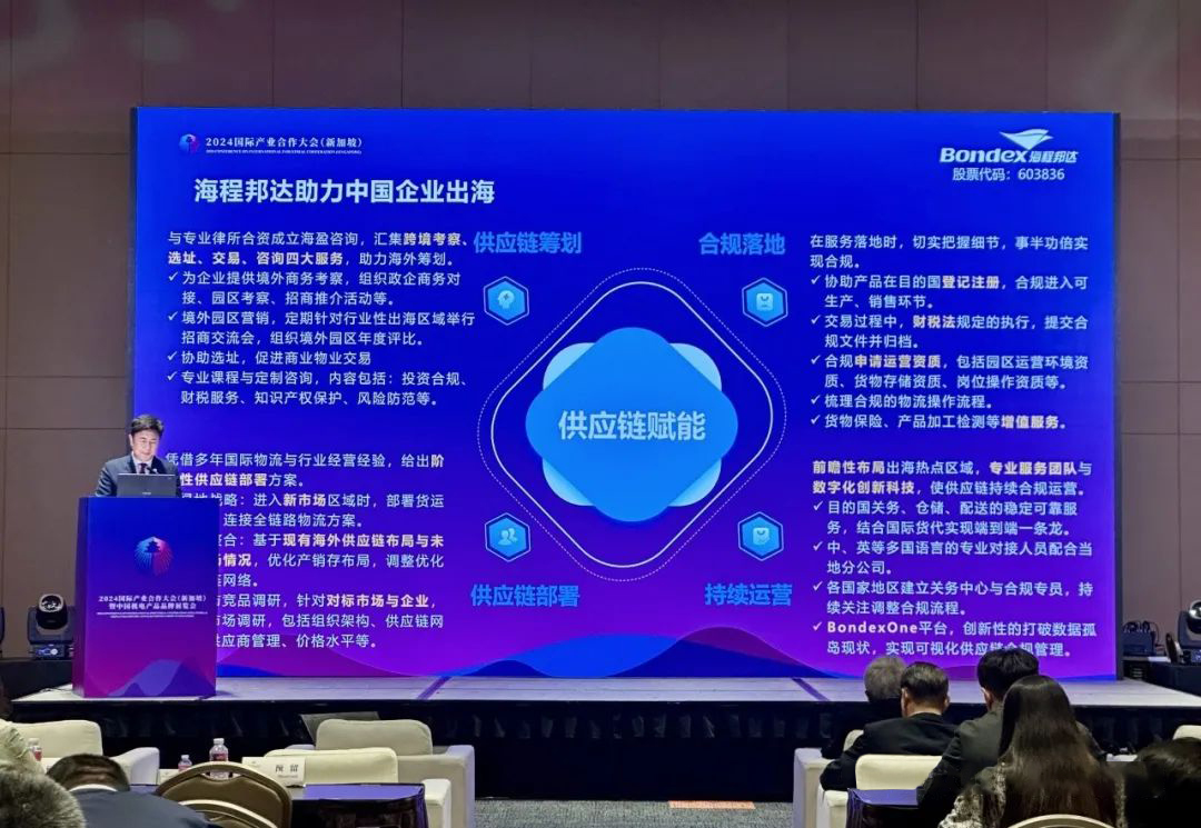 3月20日下午,由中國機電產(chǎn)品進(jìn)出口商會、新加坡中華總商會主辦、中國電建集團(tuán)國際工程有限公司、越南春橋控股公司聯(lián)合主辦的2024國際產(chǎn)業(yè)合作大會(新加坡)“園區(qū)合作—新型工業(yè)園區(qū)創(chuàng)造經(jīng)濟(jì)發(fā)展新勢能”分議題研討在新加坡博覽中心成功舉辦,海程邦達(dá)供應(yīng)鏈管理股份有限公司董事長唐海出席并發(fā)表了精彩的致辭演講。