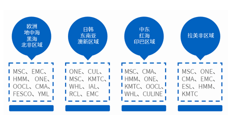 - 優(yōu)勢船東:MSK、MSC、CMA、OOCL、COSCON、EMC、ONE、YML、HMM、HPL、WHL、SML、ZIM、SLS、MATSON等
